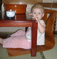 Saffron trying out the chair on the floor in our hotel room! We stayed in a basic Japanese place, with tatami mats and futons.