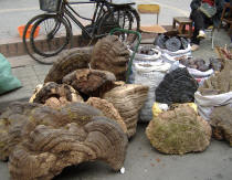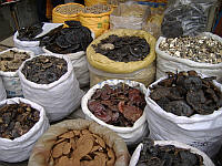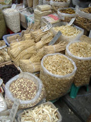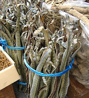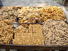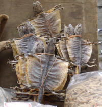 snacks for sale in the village, and duck and duck sausages drying on a tree