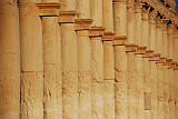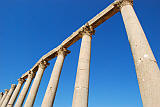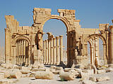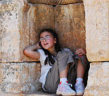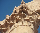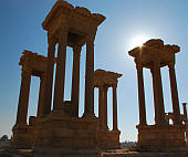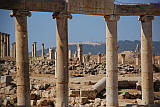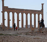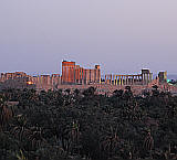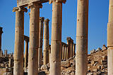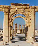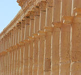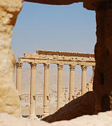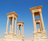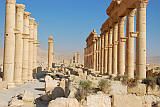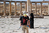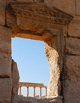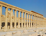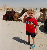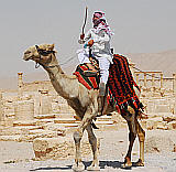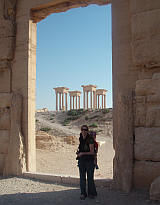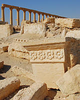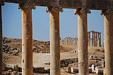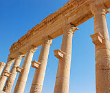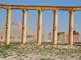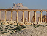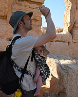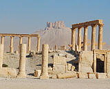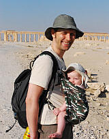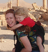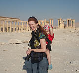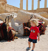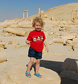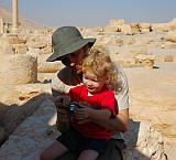 Following dinner in Palmyra we had a late night beer at the Heliopolis Hotel as the sun went down over the ruins. The view from the terrace on the top floor there was great. Then the next morning we rose early and were out at the ruins at 7am. As the daughter of a classicist Kirsty has seen a good few Roman remains in her time but these really did totally blow her away. They were amazing – a true highlight of the trip – and at that time in the morning there was virtually no one else about and we felt like real explorers. The only other people were a few local guys zooming round on motorbikes trying to sell postcards (not very hard – one NO and they went away!) and a few camel guides. In fact until we got to the temple of Bel at about 9:30 we probably only saw half a dozen other tourists – then suddenly there were 4 tour busses!! The ruins are mostly 2nd century AD and the excavated remains stretch over 50 hectares (so far) – needless to say, with 2 kids we didn’t manage them all, but we did cover a lot of ground! The Arab castle Qala’at ibn Maan up on the hill behind the site provided a dramatic and contrasting backdrop too. And the skies were an amazing blue once the early morning haze had lifted and before the midday glare set in. |