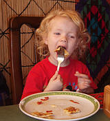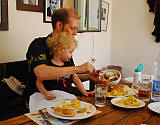 Saffron tucks in to that universal backpacker cuisine, the pancake! |
