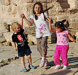 We left Abu Dhabi with our one rucksack (weighing 18kg at check-in) and flew to Queen Alia International Airport, Amman, Jordan. Getting visas on arrival was no problem and we were met by a driver we’d arranged from the hotel we’d booked. Rather than stay in Amman, we headed straight to Madaba, a lovely relaxing little town famous for its mosaics, particularly one of a map of the biblical lands, supposedly constructed in AD560 and containing more than 2 million pieces. The first night we just went for food, and had, looking back, some of the best mezze of the whole trip – we went back for lunch again the next day too we loved the place so much. Next morning we set off to see the mosaic map, which is on the floor of St Georges church which is guarded by armed police, despite Madaba being known for being a centre of religious tolerance. We also visited the archaeological park where mosaics date back to the 1st century BC, and include an amusing one of Aphrodite topless and smacking Eros! The afternoon was spent chilling by the pool where Tommy and Saffy swam and threw themselves about, whilst Indy and Kirsty sat and sunned themselves whilst reading Ahlan magazine (Ahlan being the Arabic word for “Hello”!). |