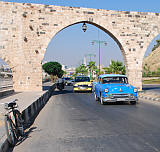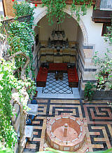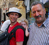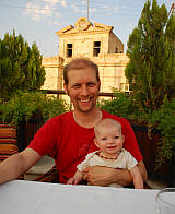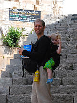 Maha also took us on a tour of the Al Jdeida district of Aleppo, especially, being a Christian, the churches – of which there are many! This district is one of the most attractive in Aleppo and has many renovated building which are now upmarket restaurants and hotels (including ours – we splashed out – well it was our wedding anniversary!!) all set around courtyards with fountains. Very atmospheric. She also took us out and about around the new city and told us all about the developments Bashir has implemented for modernisation of the country – the Syrians definitely act as if they think he’s wonderful, his picture is absolutely everywhere! Kirsty also took a wander around the backstreets of Al Jdeida at 6am when Indigo refused to sleep! The only people who seemed to be up were the bakers and we constantly had breads stuffed into our hands, until no more could be carried! It was a great time for getting photos of the rambling alleyways, but people in Syria don’t seem to like having their photos taken – which is slightly annoying, especially given how they all seem to want to take photos of our kids. In the end we started saying to people that they could only take photos if we could too. We spent the morning hanging out at the hotel and taking advantage of the nice facilities – Saffron and Indigo had a wonderful time blowing bubbles and running round (Saffy anyway!) in the old courtyard. Later on we explored the old city with its huge souk, impressive mosque and citadel – yet again, we failed to find Snow White or any of her fairy tale contemporaries! And then we went for a great dinner of pizza and pasta with chips – we were all, especially Saffy, a little mezze’d out having had combinations of bread and hummus and labneh for breakfast, lunch and dinner most days! This was followed by a beer in a street café overlooking a town square – a simple pleasure which was all the more wonderful as it’s something we very definitely can’t do back in Abu Dhabi. That evening Indigo had her overnight train journey initiation! We took the midnight train from Aleppo back to Damascus. 600 Syrian pounds (or 6.50 GB Pounds!) got us our own compartment with 2 beds. Indy and Kirsty had the top bunk and Saffy and Tommy the bottom. The beds were divine, definitely the most comfy train beds we’ve ever experienced (and Kirsty (being a bit of a train geek) has done a lot of overnight trains in at least 10 different countries!) – which was a real waste given that the journey was only 7 hours!! |