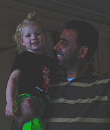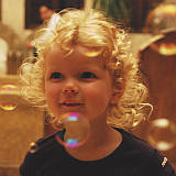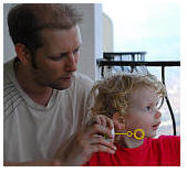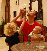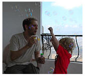 Daddy and the girls blowing bubbles in the hotel courtyard |